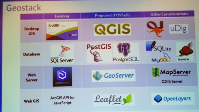 Currently he is using ArcGIS Desktop as his desktop GIS, SQL Server as a database, ArcGIS Enterprise as a web server, and ArcGIS API for Javascript for his web GIS. Samuel’s main costs are ArcGIS Desktop which costs him $7200/annum. To look at ways to lower his costs Samuel decided to experiment with open source geospatial software; QGIS for his desktop GIS, PostgreSQL/PostGIS for his database, GeoServer for his web server, and Leaflet or OpenLayers for his web GIS (all part of the OSGEO open source geospatial stack). Some of the things he found in his proof of concept are surprising, others perhaps not so to folks who have been working with open source geospatial software for years. His most important findings from his perspective is that QGIS is a very stable, very powerful alternative to ArcMap. He also found that PostgreSQL/PostGIS is a stable alternative to SQL Server. He found that migrating data from an ESRI Geodatabase is much easier than he expected. He had some problems with Leaflet and WMS attributes, and preferred the greater functionality of OpenLayers.