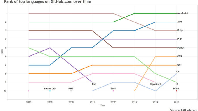 Earlier this week Github published a graph showing the relative popularity of programming languages among GitHub development project repositories, both private and public, for 2008 to 2015.