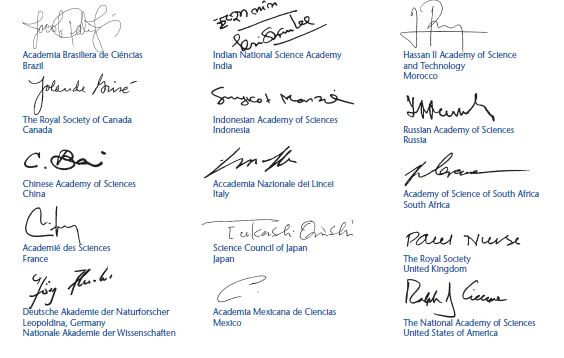 G-Science statements addressed to the world’s G8 leaders have been signed by the leaders of National Science Academies from Brazil, Canada, China, France, Germany, India, Indonesia, Italy, Japan, Mexico, Morocco, Russia, South Africa, the United Kingdom, and the United States. The statements ask for more involvement of science in addressing