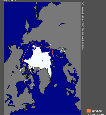 Researchers at the University of Bremen have reported that according to their calculations September 8, 2011 represents a new record minimum for the extent of Arctic sea ice extent. They used high-resolution microwave data from a sensor on NASA’s Aqua satellite. They estimated that the observed sea ice extent was 4.24 million km2, 27,000 km2 less than the previous record in 2007. However, other researchers report this year’s minimum extent was a close second to 2007.