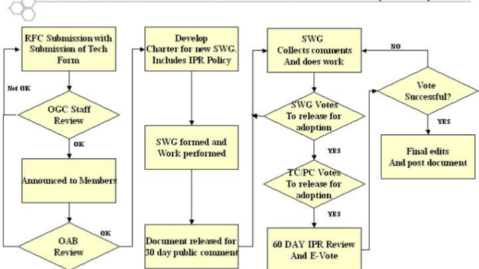 The Open Geospatial Consortium (OGC) standards process is quite nimble compared to other standards development processes, but it still involves multiple steps and the overhead of the formal process discourages developers from participating. For reference the Request for Comment(RFC) procedure is the most common way for a candidate standard to enter into the OGC standards approval process. A very good guide has been prepared for submitting an RFC to the OGC and then manoeuvring the candidate standard to final formal adoption.