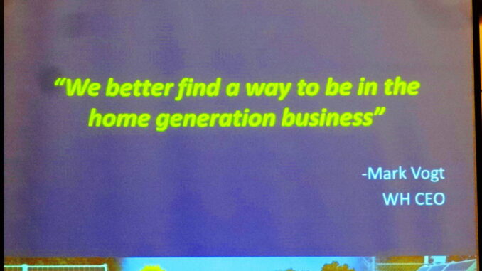 Looming on the horizon are companies like Solar City, a full service solar PV energy company that can offer a very attractive solar package that doee not involve the local power utility once the power rate from the local utility reached 14 cents/kWh or above. Solar City offers a unique leasing plan that requires no money down. It offers a flat rate for 20 years, and payments are made against savings from the monthly utility bill. According to Rod Nikula, Solar City is taking 600 homes off the California power grid every month. Mark Vogt, CEO of WH, put two and two together and concludes that “We better find a way to be in the home generation business,” or face a serious drop in revenue.