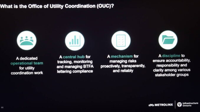 Infrastructure Ontario and Metrolinx decided to keep the regulatory “big stick” as a rarely used exception and focused on developing a collaborative approach to utility coordination as a more productive and efficient way to achieve better utility coordination. In this vein the Utility Coordination Program (UCP) was launched in March 2020 with the goal of formalizing a new, more streamlined way of performing utility relocation work by enhancing coordination between stakeholders groups. The immediate objectives of the UCP were the development of a Utility Relocation Guideline and associated workflows. At the same time the Office of Utility Coordination (OUC) was created to monitor compliance with the processes designed by the UCP. Infrastructure Ontario began working with key utilities and telecoms, the Ministry of Transportation, the ministry responsible for the act, and Metrolinx, to develop a program to improve utility coordination. The goal of ths UCP initiative was a coordination scheme that would allow Metrolinx and utilities to work together to coordinate underground utilities without constantly relying on the legislation. To achieve this all of the industry stakeholders met at the beginning of the project to map out step-by-step how the work would progress. It was recognized that construction does not flow in a linear fashion, a lot of the work is happening simultaneously and there are hundreds of thousands of conflicts constantly occurring within the program at different stages. But major workflows were mapped out and a consensus was arrived at with all the utilities impacted by those workflows. The result was a well-documented understanding how construction would progress and what was required of each stakeholder at each step along the way. The results of these efforts were encapsulated in the Utility Relocation Guideline, which formed a set of regulations that became part of the BTFA act. It is a manual for how organizations will use the utility relocation workflows that have been developed.