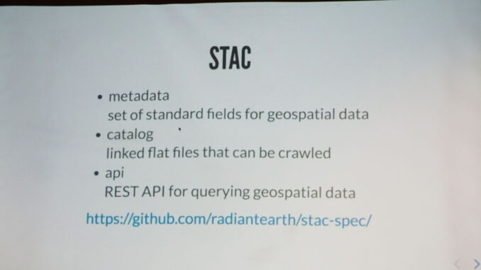 One of the things that is required to make the vast quantity of satellite imagery easily searchable is a common way to query satellite data. The SpatioTemporal Asset Catalog, known as STAC, is an open specification that came about when fourteen different organizations came together to increase the interoperability of searching for satellite imagery. At this year’s FOSS4GNA (Free and Open Source Software for Geospatial North America) get together in St Louis, Matt Hanson, of developmentSEED, gave a technical overview of the STAC standard and described one of the first implementations. The context for Matt’s STAC presentation was provided by Chris Holmes’ keynote in the morning.