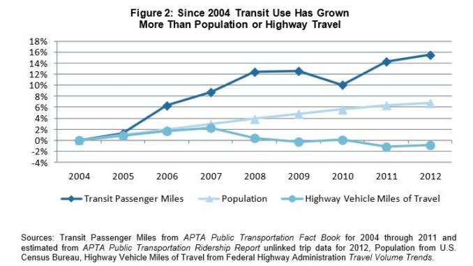 Over the 18 year period 1995-2013, public transit ridership grew 37.2 %, faster the population growth of 20.3 % for the period. APTA starts its analysis in 1995 number because after that ISTEA legislation and other surface transportation bills led to increased funding for public transportation.