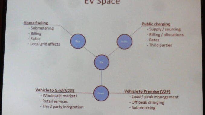 But from the perspective of the market, PEVs present challenges. David broke these down into issues relating to home fueling, public charging and how to handle fleets, for example, the Department of Defence and companies like Frito-lay have bought a considerable number of PEVs. The issues involve rates, submetering, the relationship with third party vendors who provide charging services, demand response, and so on.