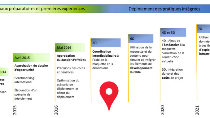 - April 2015 – Approval of the business opportunity. International benchmarking study of experience of several international organizations in the field of BIM by l’École de technologie supérieure (ÉTS) de Montréal . Development of a deployment scenario.