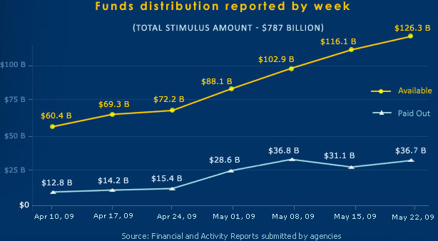 As I blogged in the middle of May Recovery.gov is reporting on a weekly basis the stimulus funds that are available and the amount actually paid out. The amount of funding available continues to rise at a steady pace, but getting it out the door is having its ups and downs.