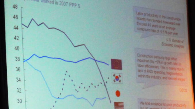 McKinsey says that construction productivity has stagnated or declined in many countries and gave historical construction productivity data for the European Union, Korea, Japan, and the U.S.