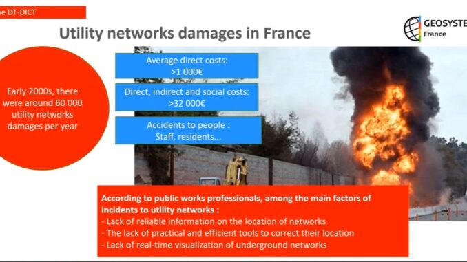 In early 2000, the French government investigated damages in utility networks, of which there are something like 60,000 incidents every year. It found that the average direct cost of each damage incident was roughly 1,000 euro, the total cost including direct+indirect+social costs was estimated to reach 32,000 euro for each damage incident, and in addition there were injuries and fatalities to workers and the public. The total cost to the French economy is estimated to be on the order to two billion euros annually. According to professionals involved in public construction project, the main causes of incidents of damage to utility networks are unreliable information about the location of underground utility networks, lack of practical and efficient tools to measure accurate locations for underground utilities, and the inability to provide real-time visualization for underground utilities.