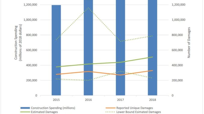 In North America every state and most provinces have enacted one call legislation. The Common Ground Alliance (CGA) has been collecting voluntarily submitted statistics on underground utility damage in North America since 2003. The latest CGA DIRT Report for 2018 concluded that progress in the U.S. in reducing damages has plateaued. Total damages in the U.S. increased from 439,000 in 2017 to 509,000 in 2018, representing a 16% increase. Damages per 1,000 one call information requests increased by 11%, from 1.87 to 2.08, and damages per million dollars of construction spending (2017 constant dollars) went from 0.359 to 0.392.