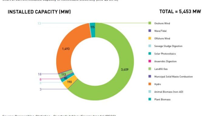 At the end of 2011, there was 4,796 Megawatts (MW) of installed renewables capacity in Scotland, an increase of 416 MW (9.5 per cent) over the installed capacity at the end of 2010. At the end of the second quarter in 2012, the total renewables capacity had reached 5,453 MW.