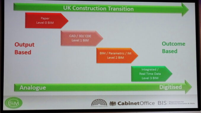 The government’s focus from the beginning has been on full life cycle BIM. Back in 2010/2011, the Government’s BIM roadmap was perceived to be very aggressive, mandating BIM Level 2 compliance for all national government projects after just five years. In the UK public projects comprise about 50% of the construction industry so this amounted to radically transforming the UK construction industry in half a decade. Put another way the construction industry had to move from thinking analog to thinking digital in just five years.
