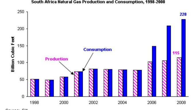 ESKOM, the South African state owned electricity company, generates two thirds of the electricity produced in Africa and provides more than 60% of Africa’s demand. ESKOM has a generating capacity of 35 GW from 20 power stations, primarily coal-fired, but also a nuclear power station, gas turbine facilities, and hydroelectric plants. The company also owns and operates the national transmission system. It relies on coal for 95 percent of its electric power generation and the government plans to increase natural gas generation from three percent to 10 percent within a decade. Since 2006 natural gas consumption has exceeded South Africa’s domestic production by a wide margin, to the point where almost 50% of natural gas is imported from Mozambique.