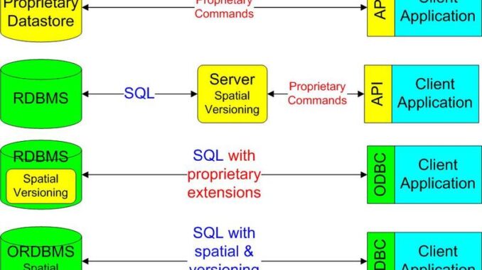 It is interesting to see how sharing spatial data has evolved over the years from proprietary files through proprietary schemas for storing spatial data in relational database management systems, to the current state where you can store just about any spatial data with topology in a modern object-relational database management system. The advantage of ORDBMS’s is that data is accessible is through an open query language, SQL, and an open interface standard such as ODBC, JDBC, and OLEDB.