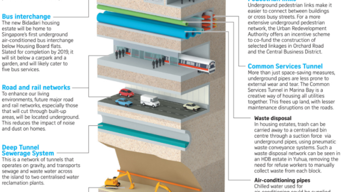 According to the Straits Times the Urban Redevelopment Authority (URA) of Singapore intends to release pilot areas of a masterplan of Singapore’s subsurface infrastructure in 2019. It will be released as part of the next national Master Plan for Singapore’s development in the medium term. When completed it will provide the first comprehensive 3D map at what lies beneath the surface from utilities a few meters deep to transportation tunnels, deep sewer lines, deep petrochemical storage, deep water reservoirs and even deep ammunition stores.