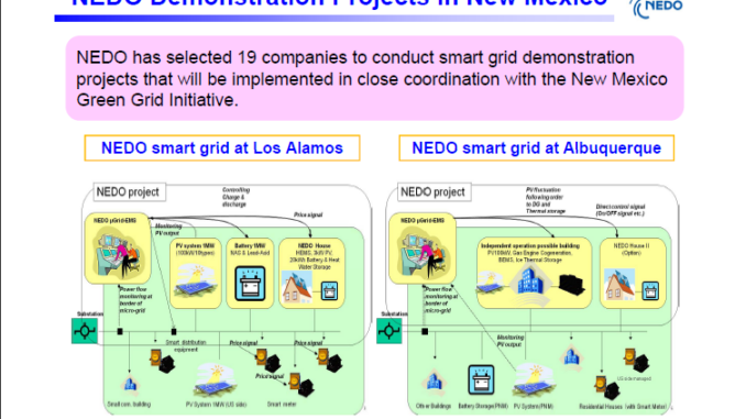 NEDO will be investing $30 million over four years on micro-grid and smart house demonstration projects in Los Alamos and in commercial areas of Albuquerque. NEDO has selected 19 companies including Toshiba and Kyocera to collaborate