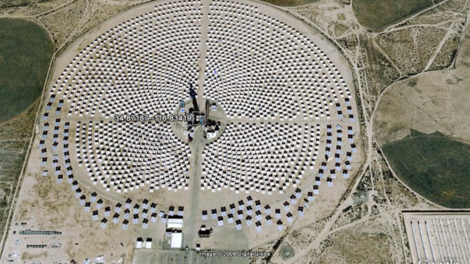 Another technology, that was used at Solar 2 in the Mojave Desert in California, is to use concentrated solar energy to heat salt (a mixture of sodium and potassium nitrates) to about 550o Celsius. The molten salt is subsequently used to heat water to create superheated steam which is then used to generate electricity. The advantage of molten salt is that it can be efficiently stored in large tanks and used at night or during cloudy periods for power generation. Solar Two in California with about 2000 mirrors could produce 10 MW and used a combination of 60% sodium nitrate and 40% potassium nitrate as the energy storage medium. (Image Solar 2)