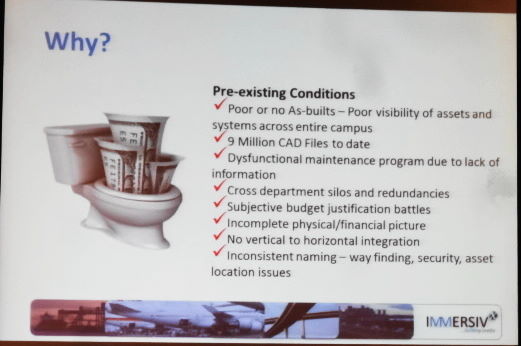 DIA is a small city and managing its infrastructure involves many of the same probelms that utilities and municipal governments have to deal with. As-builts are unreliable or not existent, which meant that DIA really didn’t know reliably where their assets were. DIA has nine million CAD files which meant a major data management problem. Their maintenance program was dysfunctional because they didn’t have the information they required to rationalize it with a data-driven process. They had a lot of redundant data because of silos of information in different departments using different applications. The most important impact of all of this was subjective decision making during the budget planning process, characterized by the so-called HiPPO (highest paid person’s opinion) problem.
