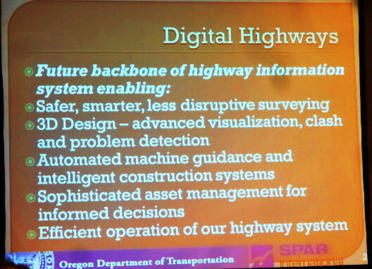 If you look at the last 25 years there has been quite a lot of automation in the form of survey automation such as electronic data collection, GPS, and basic 3D laser scanning; design automation such as computer aided design and drafting, and a bit of construction automation. The primary focus has been on speeding up the project development process, but the end goal remains 2D paper construction documents. Some people have been using what is called 2..5 D, a 3D roadbed prism with 2D objects on it. In Ron’s view the current way of designing and building highways has reached the end of it’s lifetime and a complete transformation to a new paradigm is required. The way Ron refers to this is standing the current process on its head and I blogged about it yesterday. Fundamentally it involves intelligent 3D models replacing the current as-builts and a process that speeds up project development because it leverages existing engineering data rather that requiring a complete resurvey at the beginning of every project..