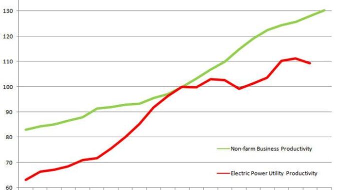 I collected some statistics from the US Bureau of Labor Statistics to compare productivity in the electric power industry to non farm industrial productivity. The results, which are shown in the attached graph, show that productivity in the electric power industry increased more rapidly than non farm industrial productivity through 1998, but that since 1998 productivity in the electric power industry has stagnated. This confirms that the electric power utility industry is facing a serious productivity problem, which could not be happening at a worse time. Green energy and smart grid initiatives mean that utilities have more on their plate than at any other time in recent memory. Retiring workers are leaving faster than younger replacements can be hired and trained. Workers who are retiring have many years experience and are being replaced with younger, inexperienced workers. And utilities are having a difficult time retaining younger workers.
