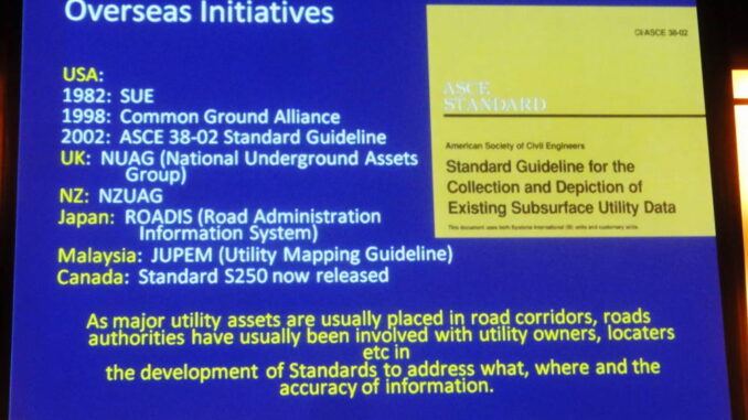 At the GITA ANZ conference in Melbourne, Bruce Potter of Cardno gave an overview of the progress toward defining an Australian standard for classifying the reliability underground utility data. Their research has identified several international standards in other countries around the world including the UK, US, Canada, Malaysia, and Japan.