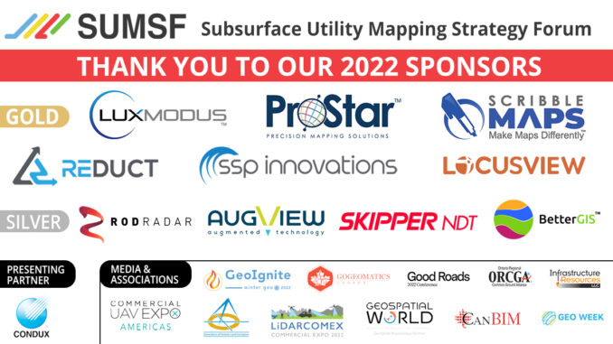 The Subsurface Utility Mapping Strategy Forum (SUMSF), Mar 22-23, 2022 is a free virtual conference that brings together individuals and organizations to share information about and contribute to improving the mapping of underground infrastructure. The priority use cases are reducing damage to underground utilities during construction and the development of subsurface digital twins.