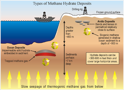 Estimates of the amount of carbon sequestered in methane hydrates and found in Arctic permafrost and in ocean sediments along the world’s continental shelfs range widely, but is believed to be large and has even been compared to the total known reserves of fossil fuels.