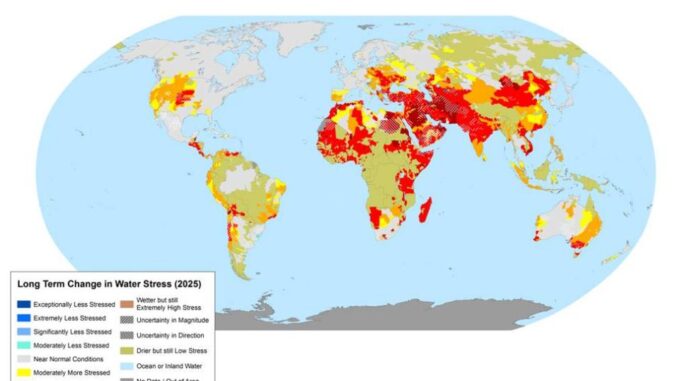 The World Resources Institute and its partners have also created maps overlaying the locations of irrigated crops worldwide onto the same baseline and projected water stress maps in 2025. About 18.5% of total global cultivated crops are irrigated. The maps show that around the year 2000, 40% of global irrigated crops were located in areas of “medium-high”, “high”, or “extremely high” water stress. By 2025, 73% of global irrigated crops could see water stress conditions grow “significantly worse”, “extremely worse”, or “exceptionally worse”.