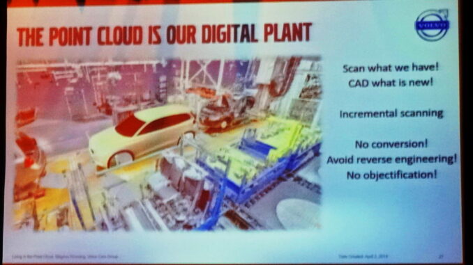 At the SPAR International Conference in Colorado Springs this morning Magnus Rönnäng, Technical Expert in Virtual Manufacturing at Volvo Car Group gave a fascinating presentation on how Volvo has transformed the modeling of their automobile assembly plant using laser scanning.
