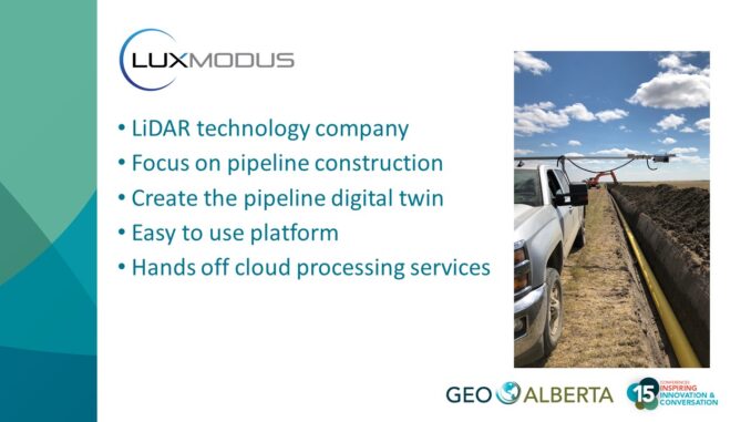Traditionally when a new pipeline is put in the ground, either its location and depth is only approximately known or it has to be surveyed by a registered surveyor. Now there is another alternative. At GeoAlberta 2018 is Edmonton Joseph Hlady of Lux Modus described how his company has developed a rig and software running in the cloud that allows this information to be captured in “near real-time” as the pipeline is constructed. The rig includes LiDAR and photo cameras which capture the trench and the pipeline by driving along each section before the trench is filled to record a point cloud and photos. The point cloud and images are uploaded for cloud processing and within minutes to hours a digital twin of the pipeline can be viewed by anyone with a browser that supports HTML5 including mobile devices.
