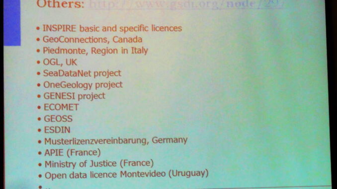 The working group has conducted an extensive review of existing licenses including efforts to standardize licensing of geospatial data such as Geo Shared in the Netherlands, Musterlizenzvereinbarung in Germany, GILF in Queensland, GeoConnections in Canada, and others.