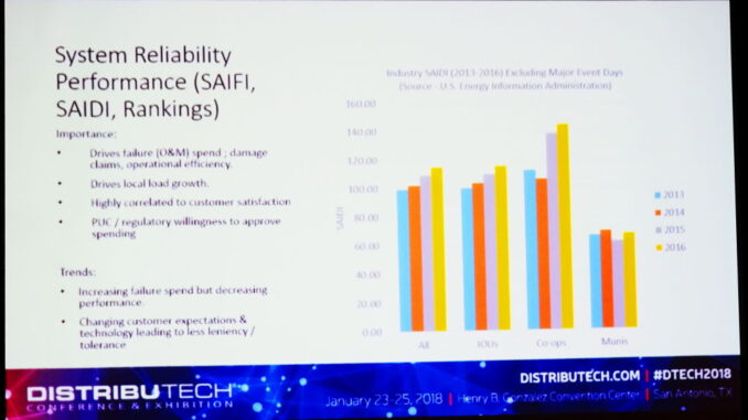 SAIDI is a statistic that regulators require utilities to provide that measures the average amount of time a customer is out of service during a year. It is used as a measure of utilities’ performance. Usually extraordinary natural events like hurricanes, tornadoes, and major natural events are excluded from the statistics. Joseph Nichols showed a graph of the SAIDI performance (excluding major natural events) for all U.S. utilities from the U.S. Energy Information Administration (EIA) for 2013 to 2016.