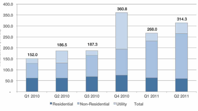 According to the Solar Energy Industries Association, the solar photovoltaic market in the US continues to expand. In 2010, 887 MW of grid-connected photovoltaic (PV) capacity were installed, doubling the capacity installed in 2009. In Q2 2011 grid-connected PV installations in Q2 reached 314 MW for a total installed capacity of 2.7 GW. California and New Jersey lead the country in PV installation.