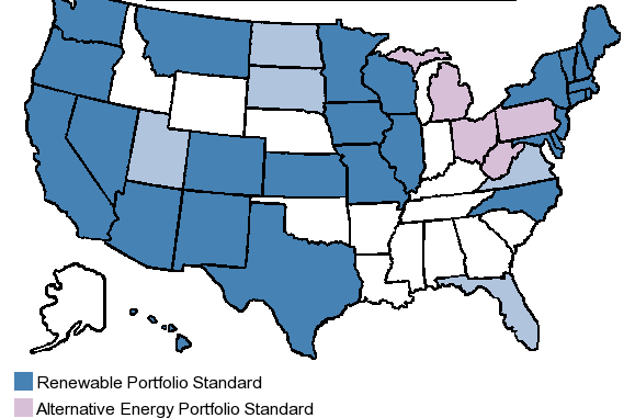 The American Clean Energy and Security (Waxman-Markey) bill, which aimed to reduce greenhouse-gas emissions 17% by 2020 and over 80% by 2050 compared to 2005 levels, was passed by the US House of Representatives, but did not make it through the Senate. So unlike the EU the US does not have a national renewable energy objective. However, 36 States have enacted various forms of Renewable Portfolio Standards (RPS) which sets objectives for renewable electrical energy sources at the state level.