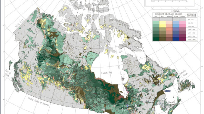 The world has about about 3 million square km of northern boreal peatlands, which are huge carbon stores, estimated to contain 200 to 600 gigatonnes (Gt) of carbon. About one million square km of these are in Canada. Peatlands act as both a carbon source and a carbon sink in the terrestrial carbon cycle. The net effect of northern peatlands is a small to moderate carbon sink, removing an estimated 49 billion kg/yr (Tg/yr) of carbon from the atmosphere.
