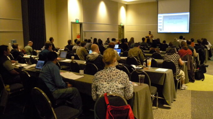 I’m at WAURISA in Bellevue, WA for a geospatial conference for a few days. The first day is devoted to workshops. The Open Source Geospatial Foundation (OSGeo) presented an introduction to open source geospatial applications and frameworks, including desktop and web-based. It was a very well-attended session with 50 to 60 people, most of whom had no prior open source geospatial experience.