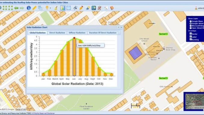 The web-based tool was developed using open source geospatial libraries including Open Layers, GeoServer, PostGIS and TileServer and relies on OGC open standards. It is intended to be extended to enable it to be used in the other 50 solar cities including Delhi. It enables users to estimate the rooftop solar power potential of selected area for different types of PV technologies such as crystalline and thin-film. It also provides tools for estimating potential green house gas mitigation through solar rooftop PV systems for a specific area. The tool is available here (or here)and Alekhya Datta encourages people to try it.
