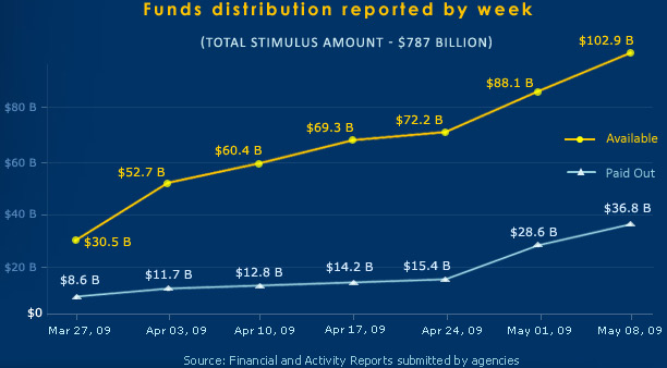 Recovery.gov is reporting on a weekly basis the stimulus funds that are available and the amount actually paid out. Detailed reports from all federal agencies will be available Sunday.