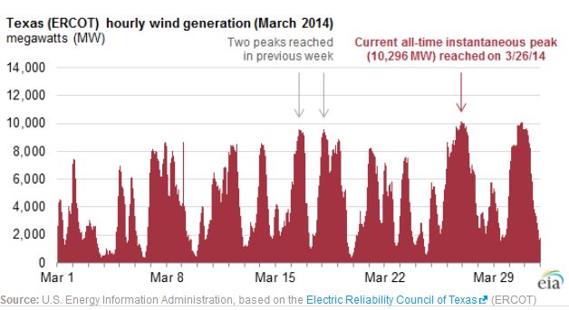 According to the Electric Reliability Council of Texas (ERCOT) via the Energy Information Administration (EIA) at 8:48 p.m. on March 26, 2014 wind generation reached a peak output of 10,296 megawatts (MW). At that moment, wind supplied almost 29% of total electricity load. The average wind production in that hour was 10,120 MW.