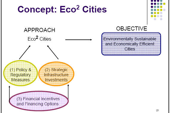 The Eco2 cities approach involves policy and reform measures and strategic infrastructure investments.