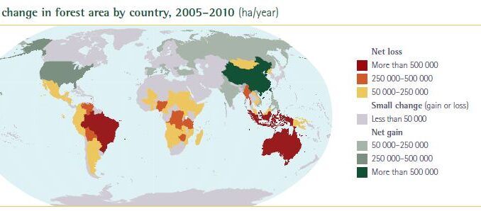 Large scale planting of trees and natural expansion of forests in some countries and regions have reduced the net loss of forest area significantly. The net change in forest area in the period 2000–2010 is estimated at –5.2 million hectares per year, down from –8.3 million hectares per year in the period 1990–2000.