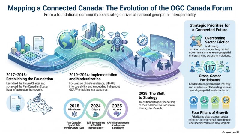 - Calgary (2024): Attention turned to the built environment, with a focus on Building Information Modelling (BIM)-GIS interoperability, climate and infrastructure resilience, and the formation of the National Council for the Digitization of Canada’s Built Environment (NCD-CBE) to support coordinated governance and adoption of standards such as ISO 19650.