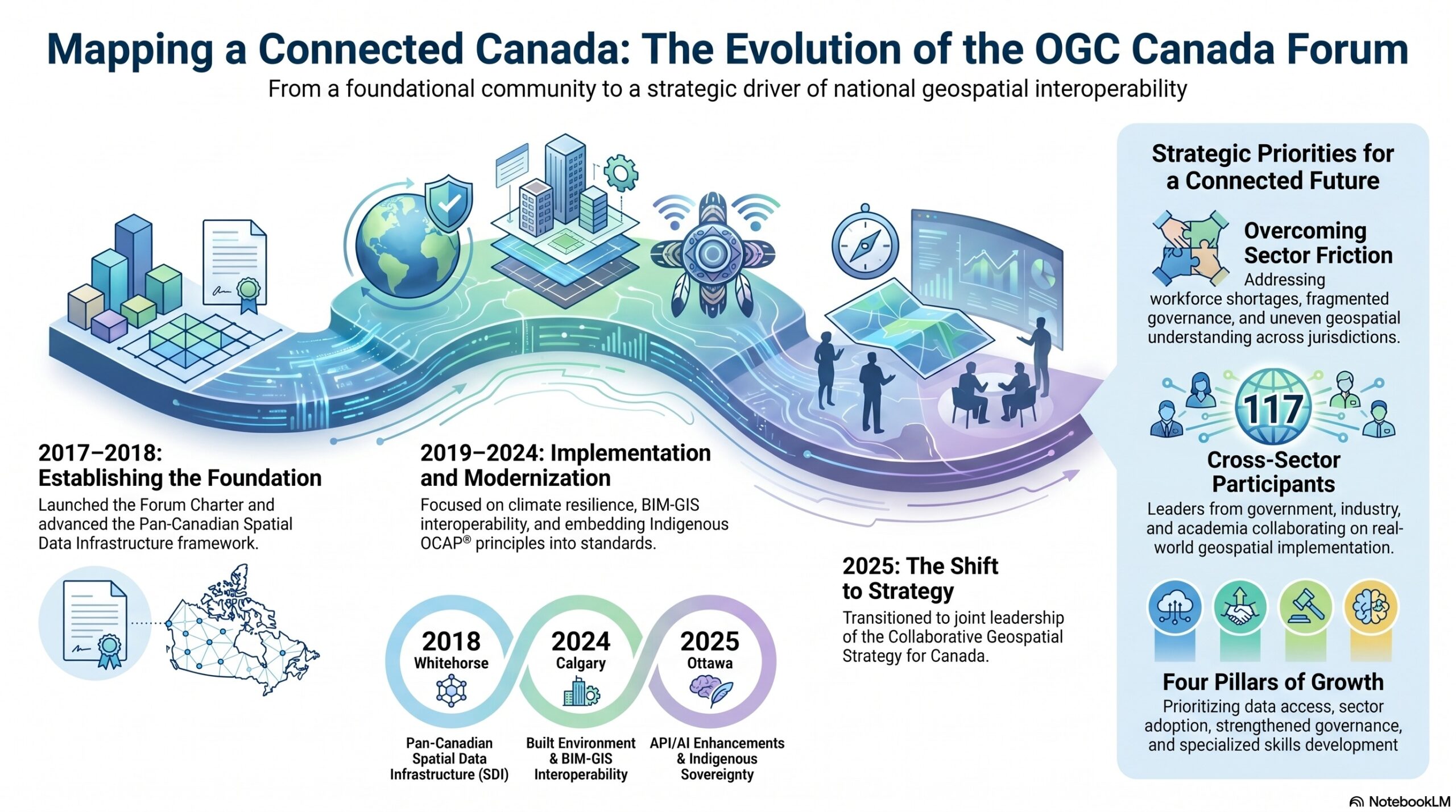 Founded in 2017, the OGC Canada Forum brings together government, industry, Indigenous communities, and academia to address a practical challenge: how to make geospatial data easier to share, understand, and use across Canada. It serves as a neutral, open platform where the community can work through real interoperability and data challenges, aligning around common approaches, shared standards, and real-world implementation. Sessions have been held across the country, alongside a growing number of virtual engagements.