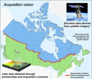 A national acquisition vision was developed, dividing the country into two main zones—south of the managed forest limit, where airborne lidar was prioritized (see green area), and north, where satellite-derived models generally met needs (see blue area). This flexible approach also allowed for targeted lidar acquisitions in northern Canada for flood mapping, forestry, and infrastructure projects.
