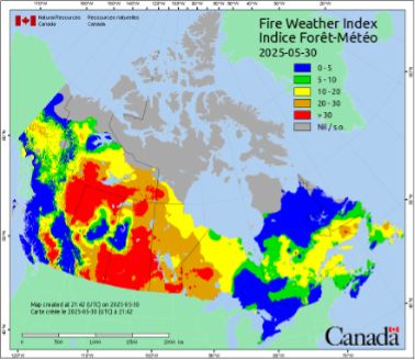 The EGS also supports the Canadian Wildland Fire Information System (CWFIS), which supports near real-time monitoring of active forest fires, and additionally work on fire forecasting efforts. One of the products they publish is the FireM3 Hotspots map which is extracted from data collected by multiple earth observation sources. This can then be enhanced by combination with data from Environment Canada to create informative products like the Fire Weather Index, seen below, that is published daily. The combination of these products contributes to early warning systems for forest fire activity, which last year contributed to the safe evacuation of the town of Jasper and Jasper National Park, an example which we will come back to shortly.