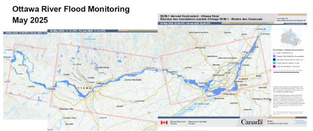 Another important service provided by the EGS is their flood mapping and monitoring program. Using the federally owned RCM, they can derive flood extents and distinguish permanent bodies of water from flooded vegetation, urban flooding, and other flooded areas. This product is available in the form of current floods, floods for year to date, and historical floods. It can be used to make informed, near real-time decisions and the interference independent abilities of SAR again come to the forefront. Below, we can see some flood extents from the Ottawa River in early May 2025.