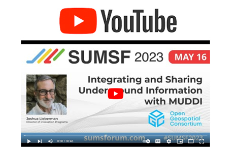 On May 16, 2023, during SUMSF 2023, Joshua Lieberman, Director of Innovation Programs at the Open Geospatial Consortium (OGC) presented a livestream talk on Integrating and Sharing Underground Information with MUDDI.