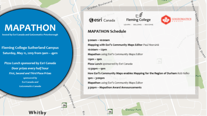 GoGeomatics Peterborough and Esri Canada are hosting a Mapathon at Fleming College to create data for the Region of Durham using Esri’s Community Maps Editor on Saturday, May 11, 2019 from 9am – 4pm. The event is sponsored by Fleming College, Esri Canada and GoGeomatics Canada. We will have a few presentations from Esri’s Paul Heersink, former Fleming Grad and Cartographer and Production Manager of Esri Canada’s Community Maps and Rob Halko, former Fleming Grad and Supervisor of GIS for the Region of Durham. A pizza lunch sponsored by Esri Canada will be provided, door prizes announced every half hour and awards will be given for volume of quality data created in the time alotted.