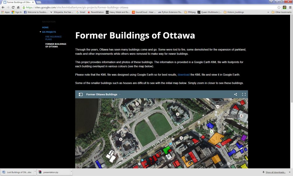 While researching historic photos of Ottawa, I became fascinated with the buildings that had been lost. Although these photos provided a visual snapshot of these structures, their locations could not always be determined from these images. As I searched the Internet and books for the history of these buildings, there seemed to be no single source of information so I decided to create one. It seemed the best option was a map (particularly KML) showing their original locations.